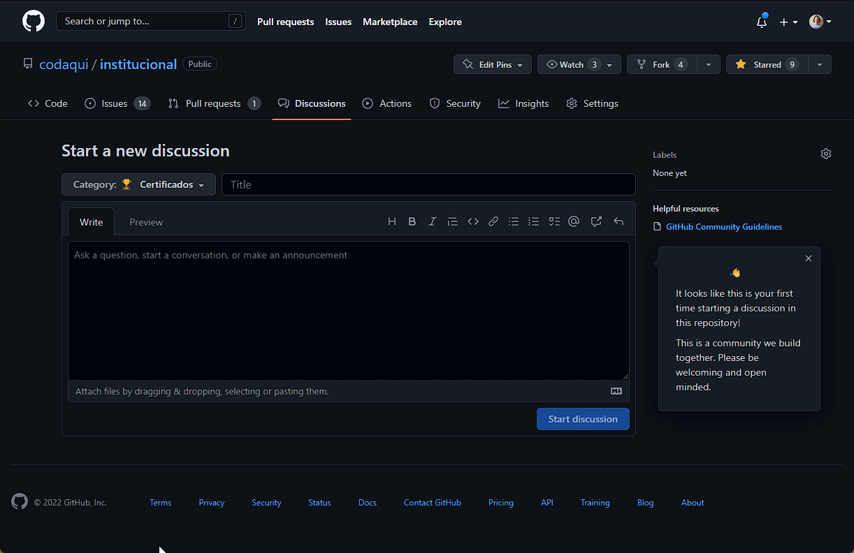 - Preencha o título da sua sugestão, começando com [NOVO CERTIFICADO], seguido pelo título do certificado que deseja sugerir. No campo "Write", escreva mais sobre o certificado que deseja que seja adicionado à Codaqui, incluindo, se quiser, sugestões de textos e exercícios (com solução) para o certificado. Ao finalizar, clique no botão "Start discussion" para enviar.