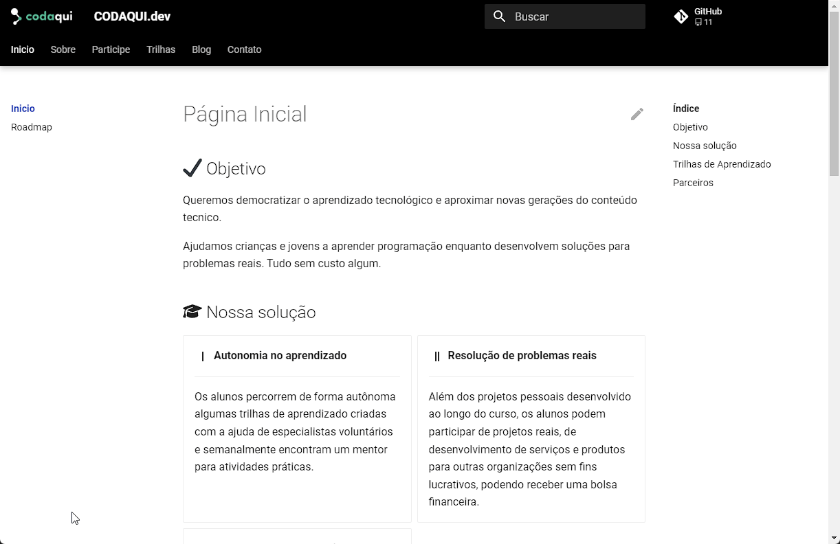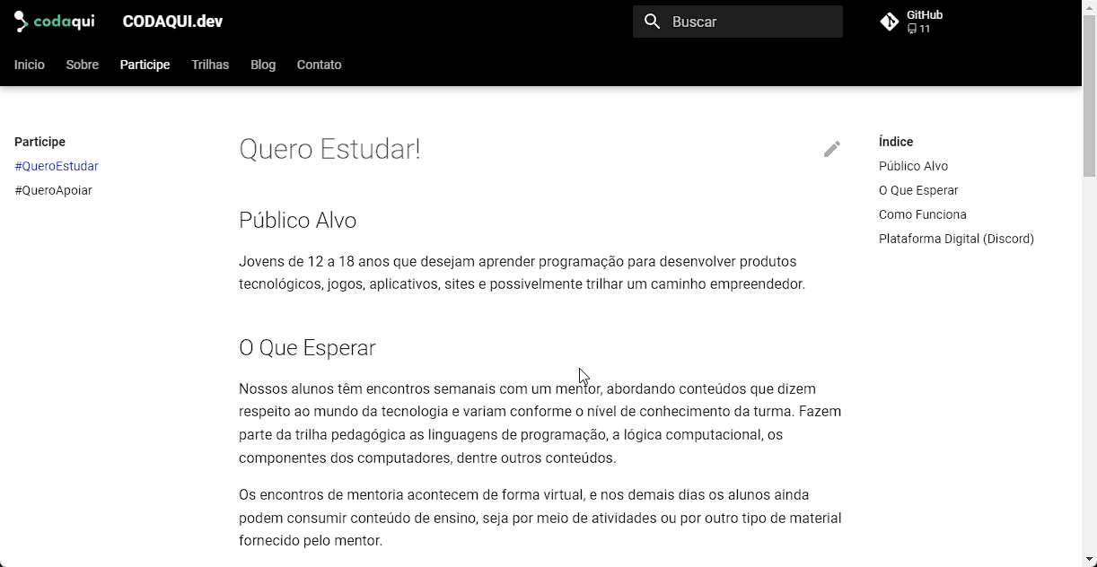 A Codaqui é uma escola de programação sem fins lucrativos que apoia jovens que desejam aprender a desenvolver produtos tecnológicos mas não possuem acesso a uma educação tecnológica por outros meios.