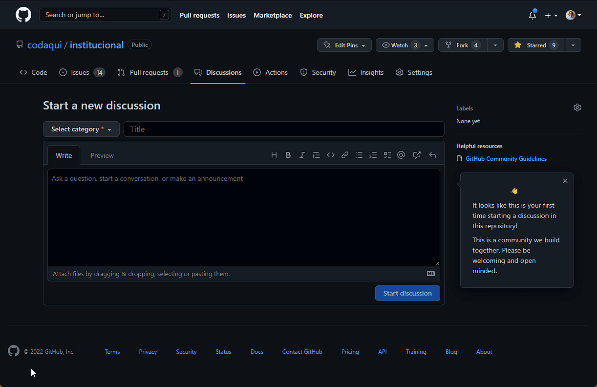 - Preencha o título da sua sugestão, começando com [NOVA TRILHA], seguido pelo nome da trilha que deseja sugerir. No campo "Write", escreva mais sobre a trilha que deseja que seja adicionada à Codaqui, incluindo, se quiser, sugestões de materiais e textos. Ao finalizar, clique no botão "Start discussion" para enviar.